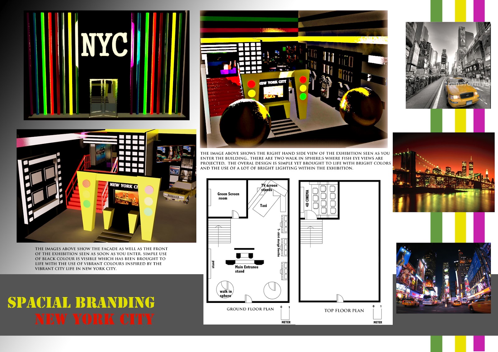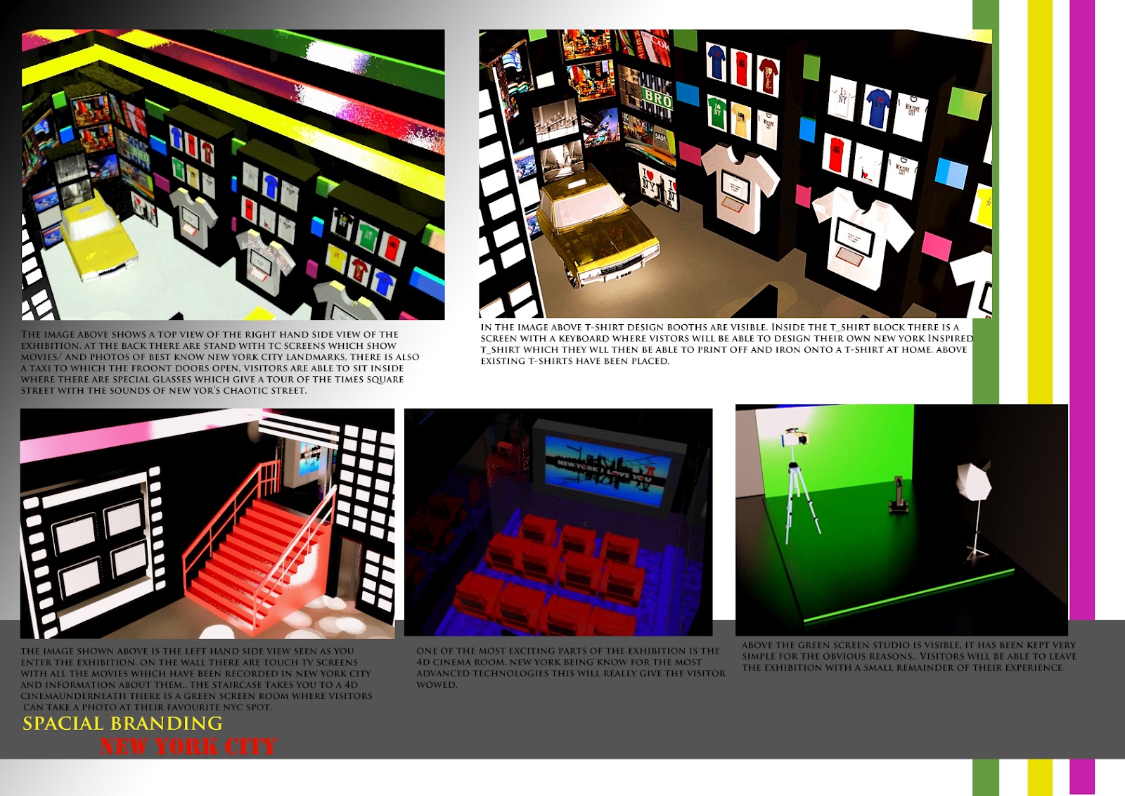 As part of this project we were to assigned to choose a brand or city on which we would then had to design an exhibition on. I chose to do my project on NEW YORK CITY. As part of my interactive activities I included touch screens , a 4D cinema and a green screen room all of these activities I believe would keep the visitors interested and would make the experience one they will remember.