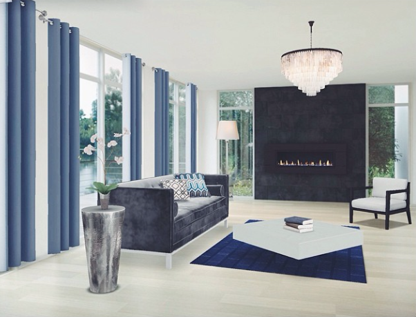 The living room is a space in a residential home where people tend to go to relax and/or socialise in. The accents of the deep and light blues in this living room create a contemporary take on your typical decor for a living space leaving it with a fresh and unique feel. A pop of colour is a great way to transform your space completely and give it a set mood, the use of dark colours with in a light space creates a moody atmosphere without being too much. The design above overall has a very masculine feel however the use of accessories such as the plant and a decorative pendant add a bit of a feminine touch to the space.